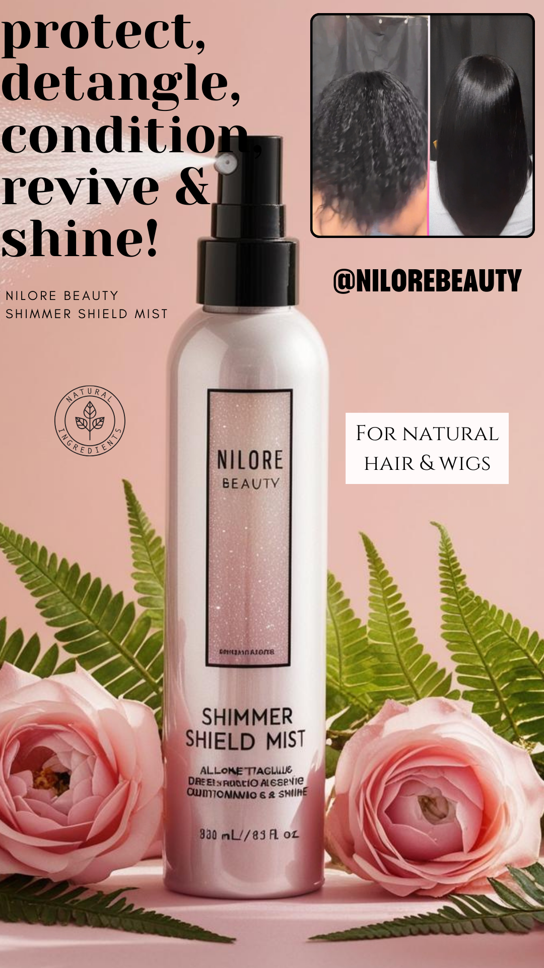 Introducing Nilore Shimmer Shield Mist – your all-in-one hair solution! This innovative mist acts as a detangler, heat protector, conditioner, and shine enhancer. It effortlessly detangles while providing thermal protection, leaving your hair silky smooth and radiant. Perfect for all hair types, Nilore Shimmer Shield Mist delivers salon-worthy results at home!